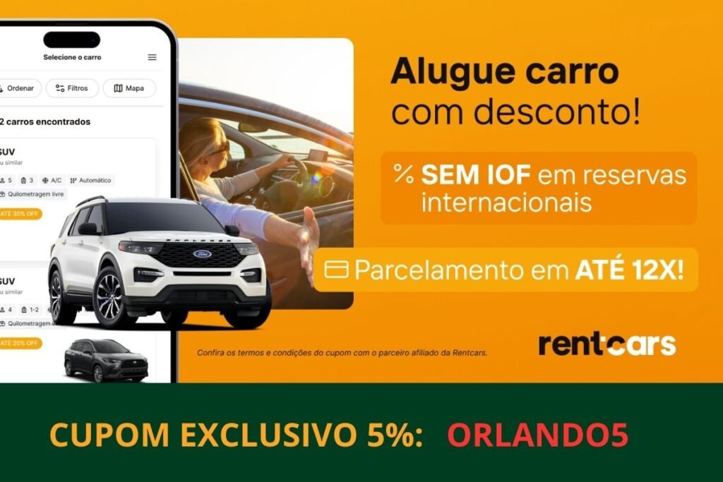Com o cupom ORLANDO5 na Rent Cars, você desconta 5% sobre esses valores e ainda paga em reais, sem IOF e parcelado em até 12x. Em uma reserva de 10 dias com um SUV, a economia total (cupom + isenção de IOF) pode representar R$ 300 a R$ 500 a menos no custo final.